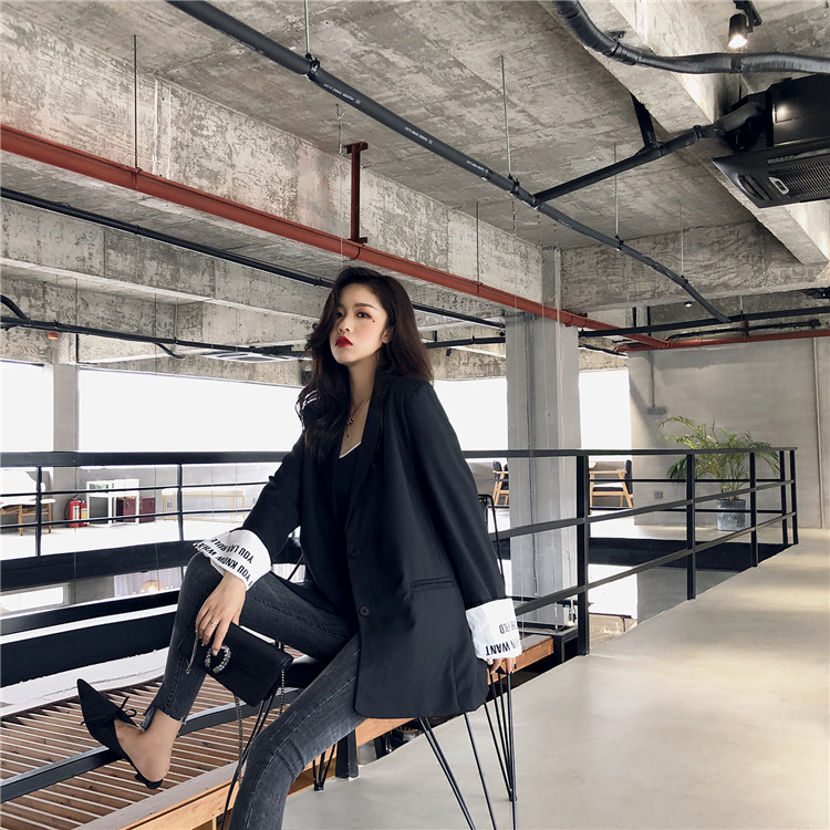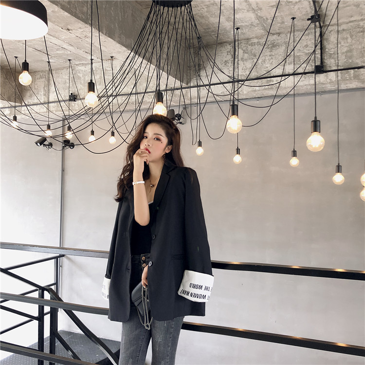 / 港風秋季時髦英倫風復古寬松顯瘦拼色袖口英文西裝外套女春秋新款