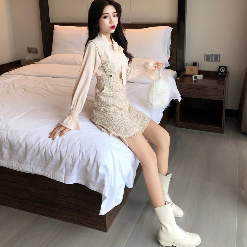 / 網紅同款秋季套裝女時尚套裝小香風仙女長袖襯衫+百搭背帶包臀裙
