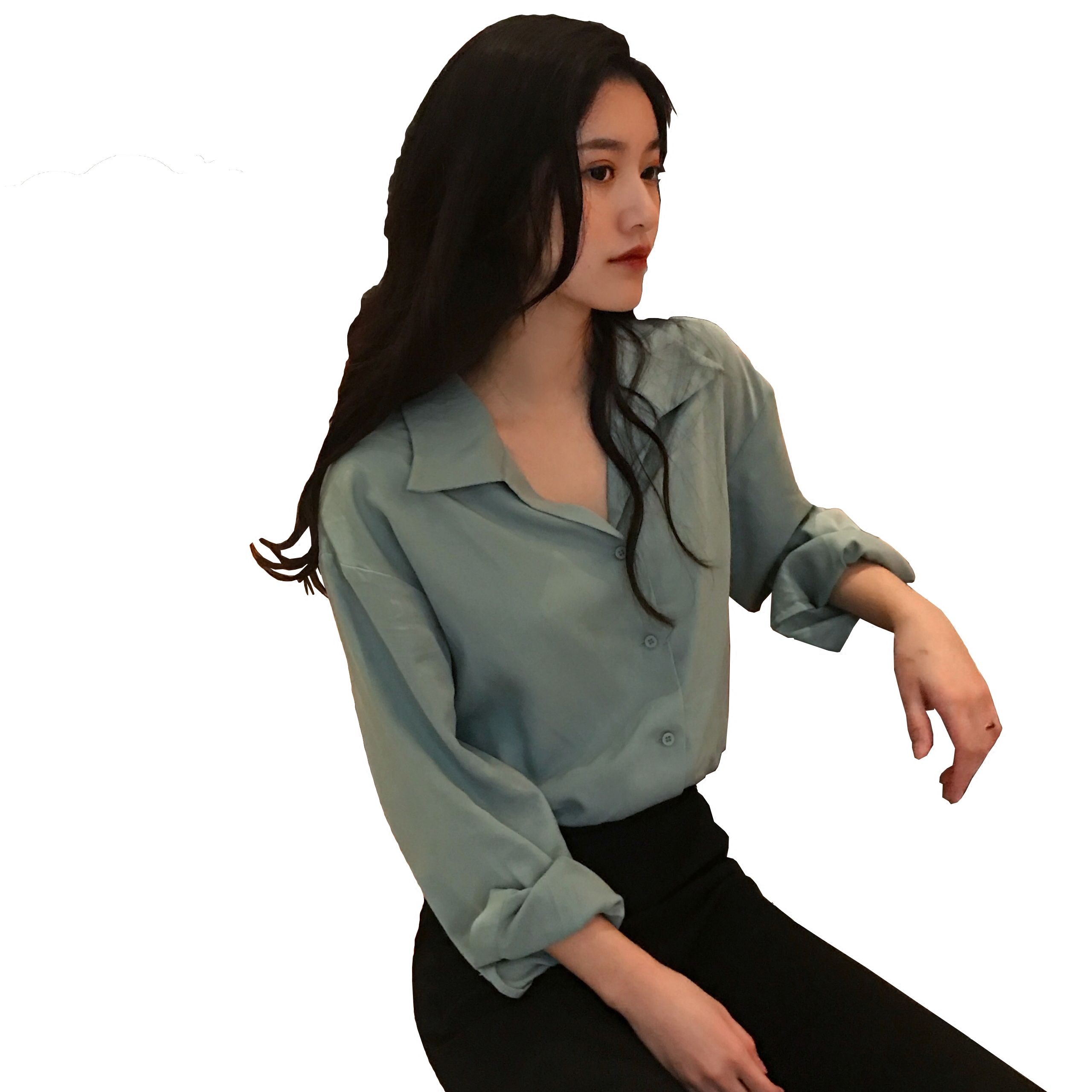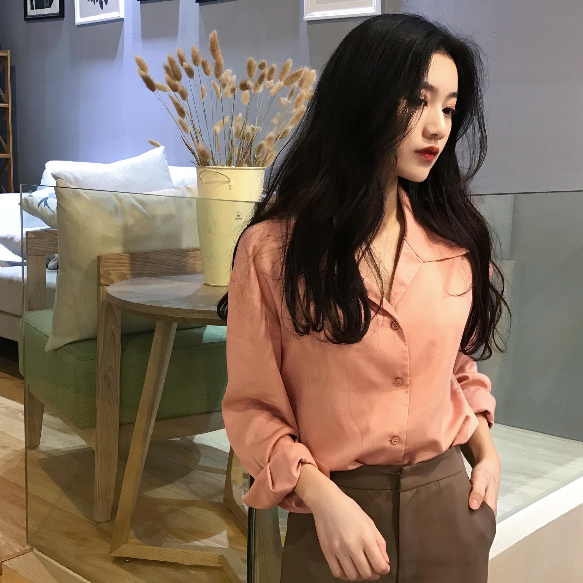 / 春裝2018新款女韓國簡約純色V領直筒百搭顯瘦長袖排扣襯衫女上衣