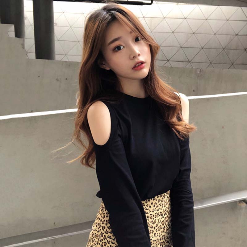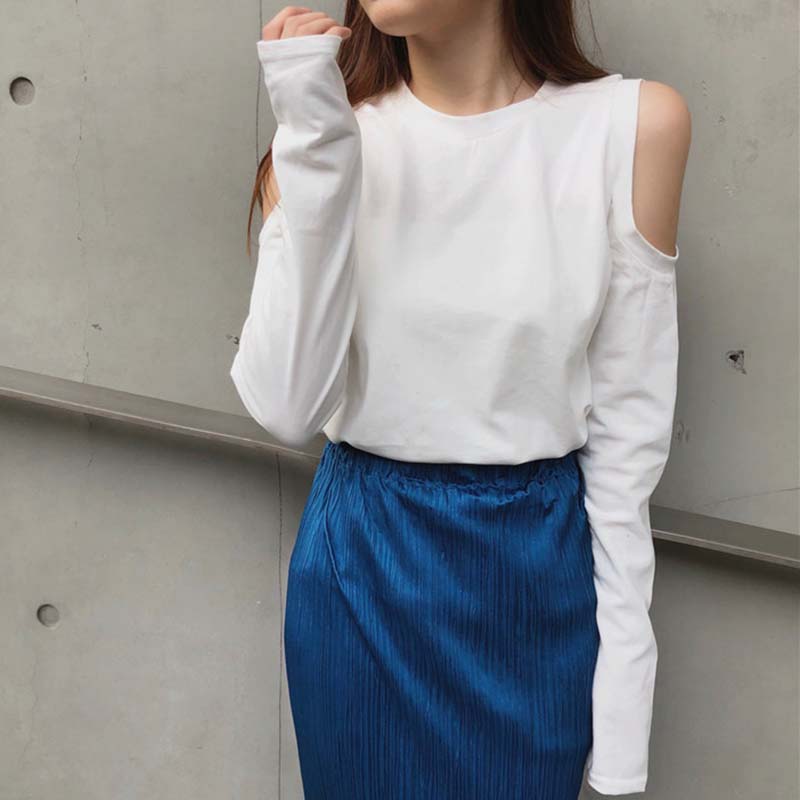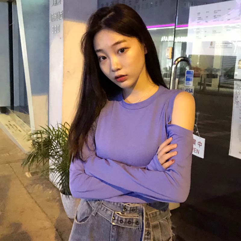 / 秋裝女新款韓版小心機露肩長袖純色T恤港風時尚修身打底圓領上衣