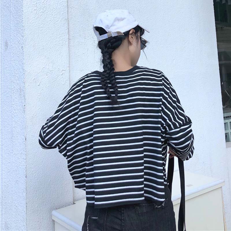 秋裝女2018新款學生黑白條紋長袖T恤韓版寬松短款露臍上衣打底衫
