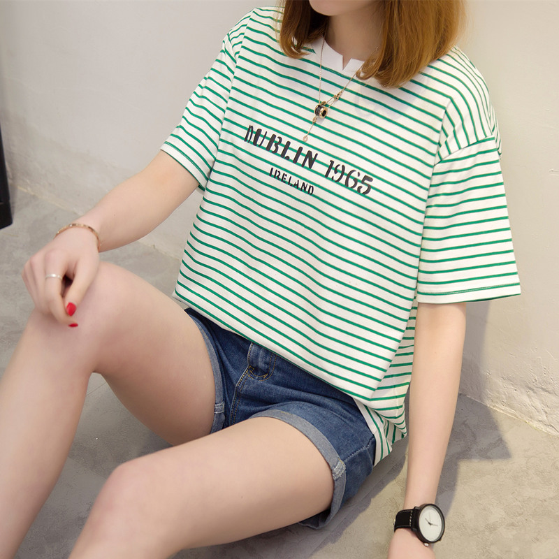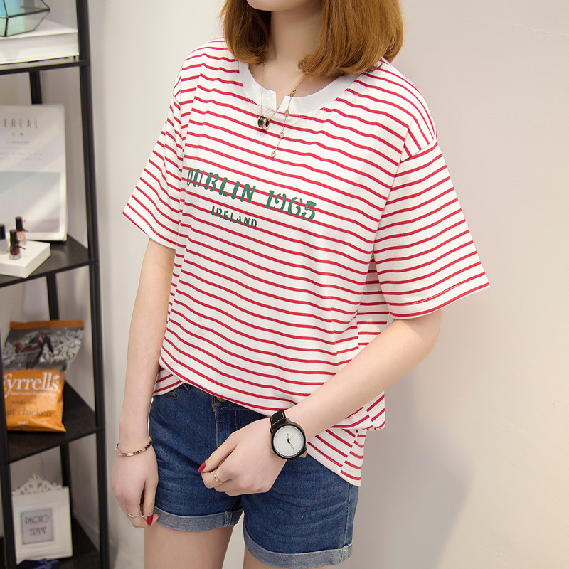 / 條紋短袖t恤女夏裝新款女裝韓版體恤衫寬松打底休閑上衣女夏