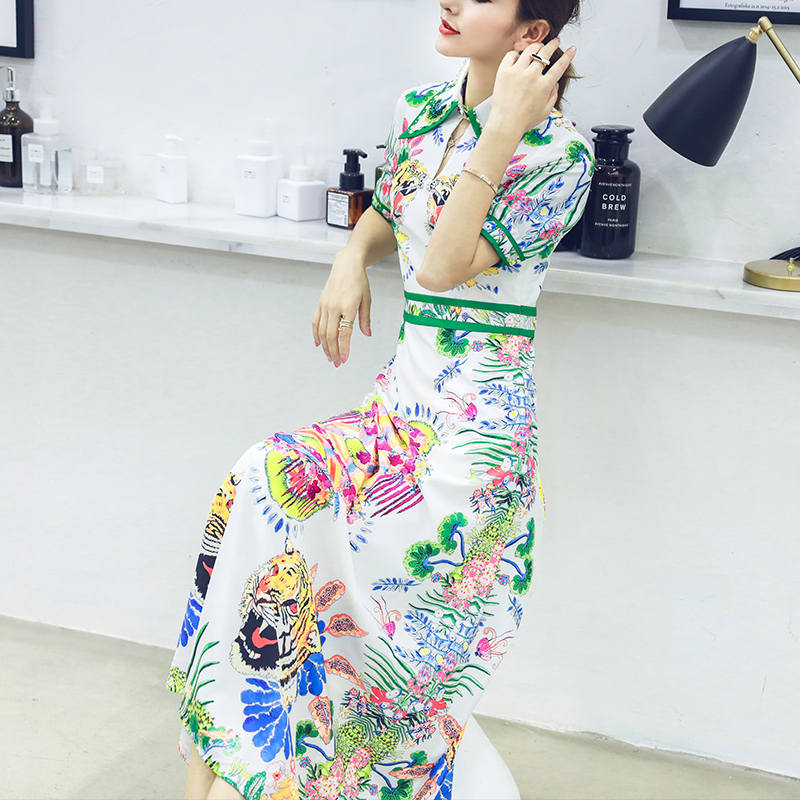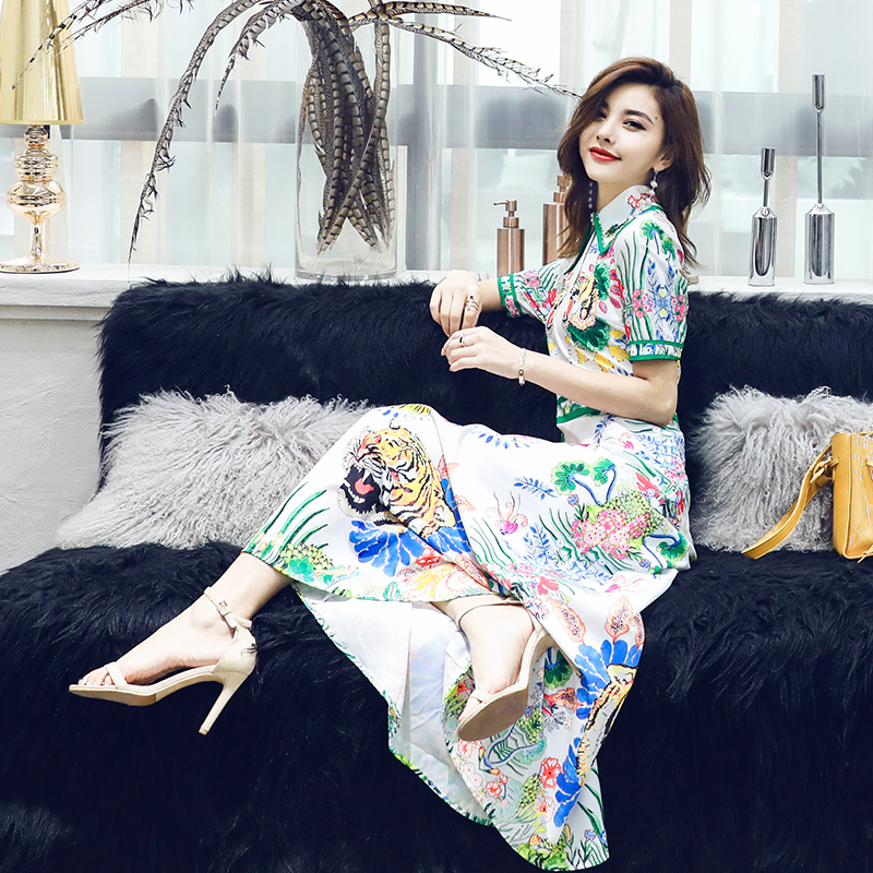 / 歐洲站短袖高腰顯瘦復古印花釘珠大擺裙長裙連衣裙女夏2018新款