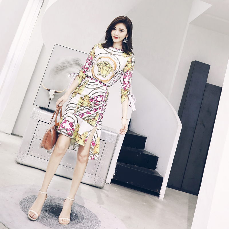 歐洲站名媛套裝夏季2018新款印花蝴蝶結上衣開叉半裙時尚兩件套潮