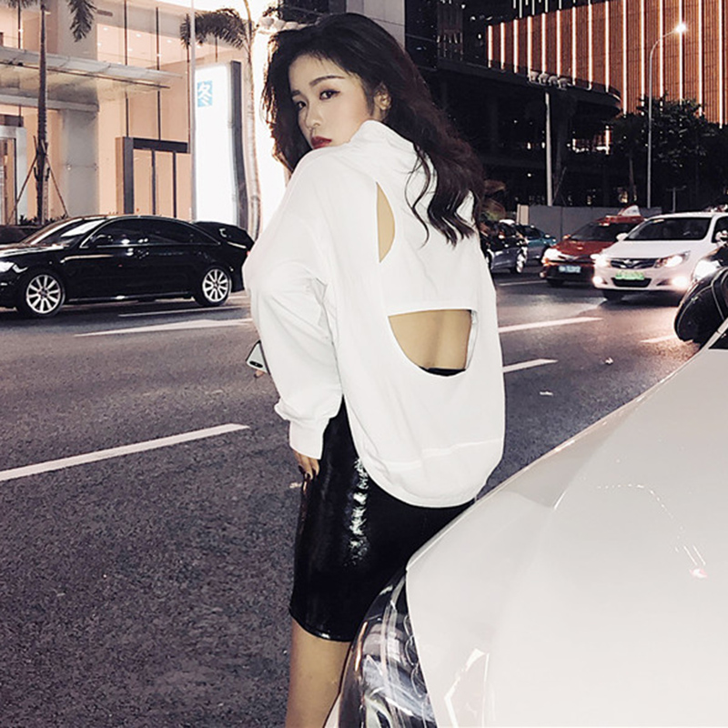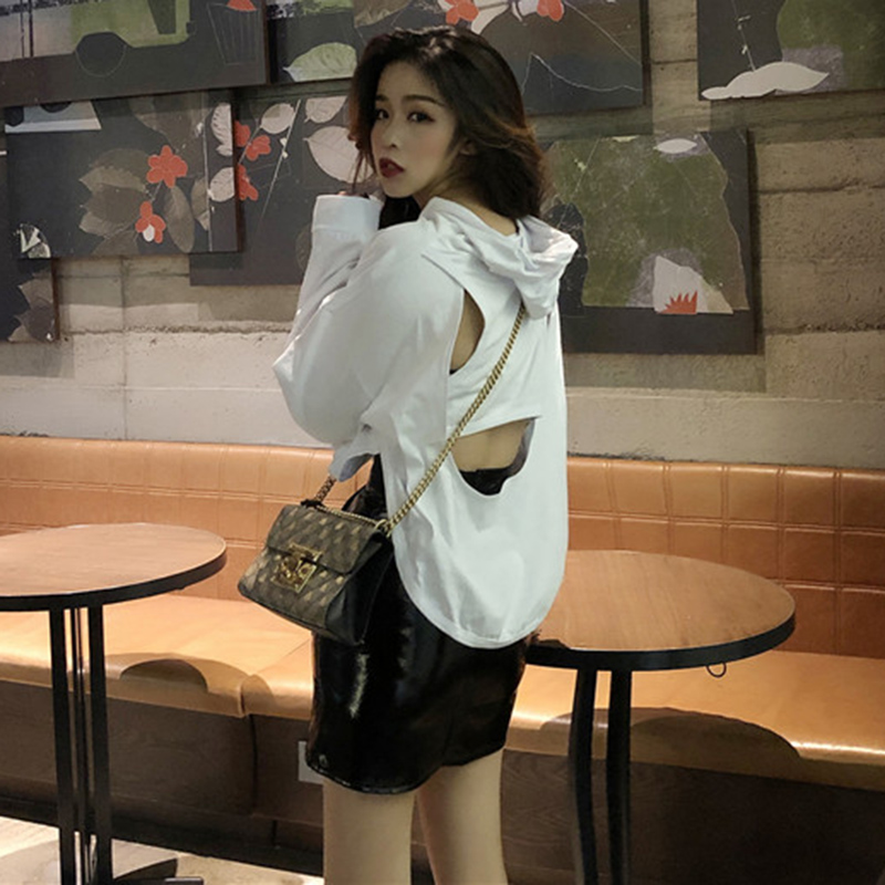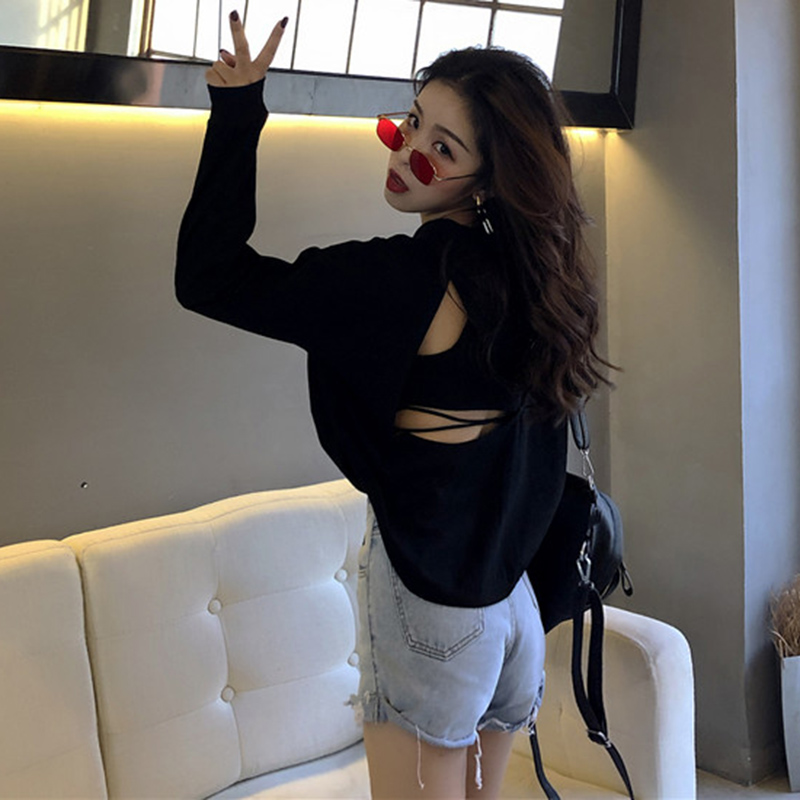 韓版女裝2018新款早秋個性心機露背連帽衛衣長袖T恤上衣假兩件潮