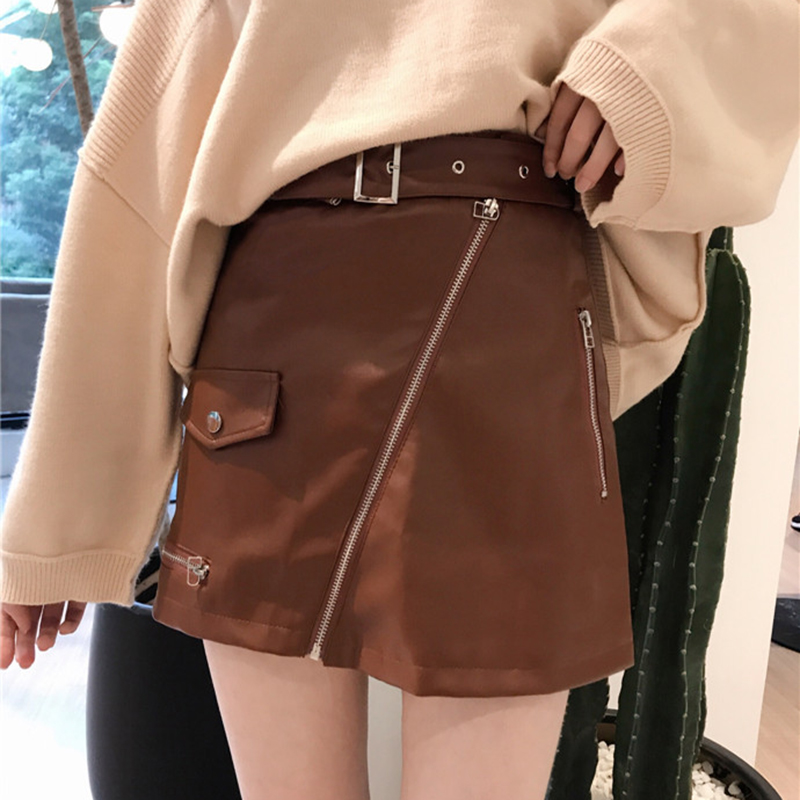 / 秋冬新款女裝高腰修身顯瘦拉鏈裝飾PU小皮裙學生包臀半身裙短裙女