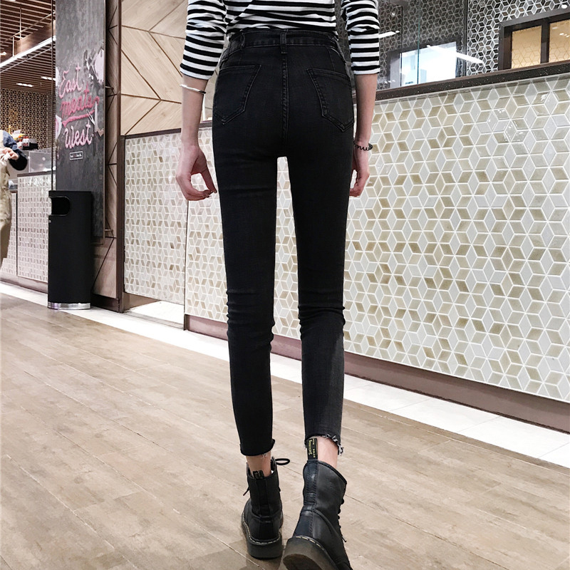 黑色牛仔褲秋裝女2018新款修身高腰單排扣九分小腳鉛筆褲打底褲子