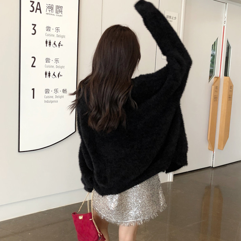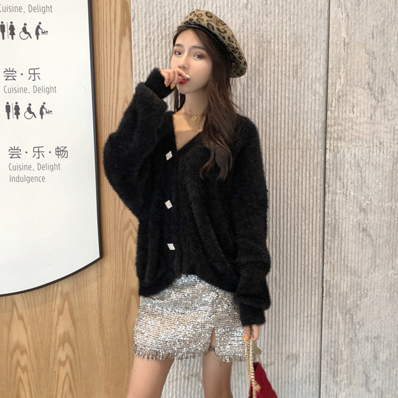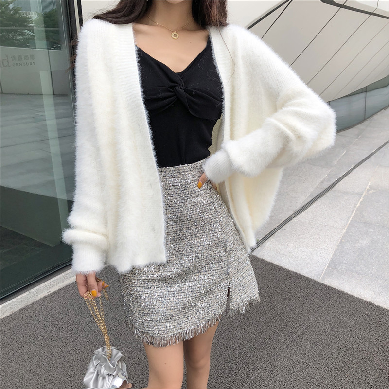 小香風套裝女秋季新款慵懶風寬松毛衣開衫外套高腰亮絲包臀半身裙