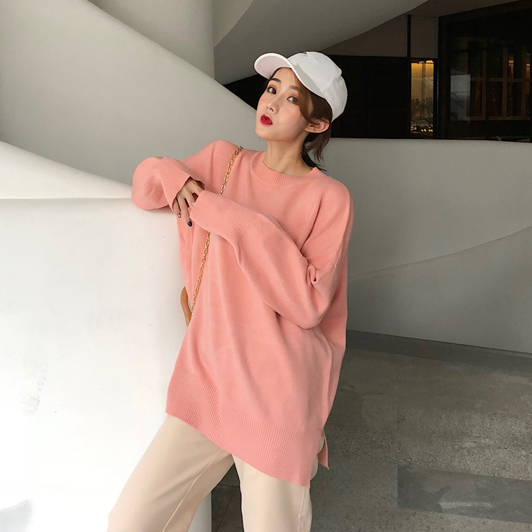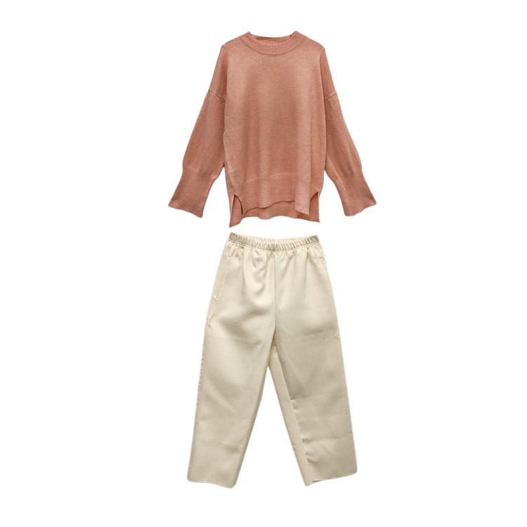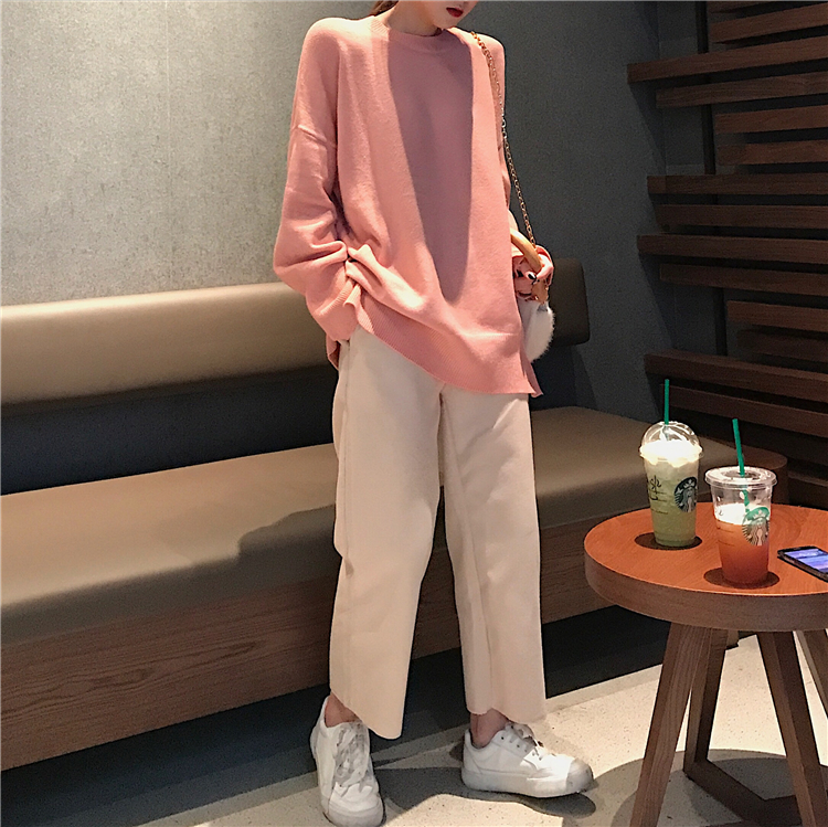 韓版chic甜美風粉色寬松圓領毛衣+顯瘦百搭純色毛呢闊腿褲兩件套
