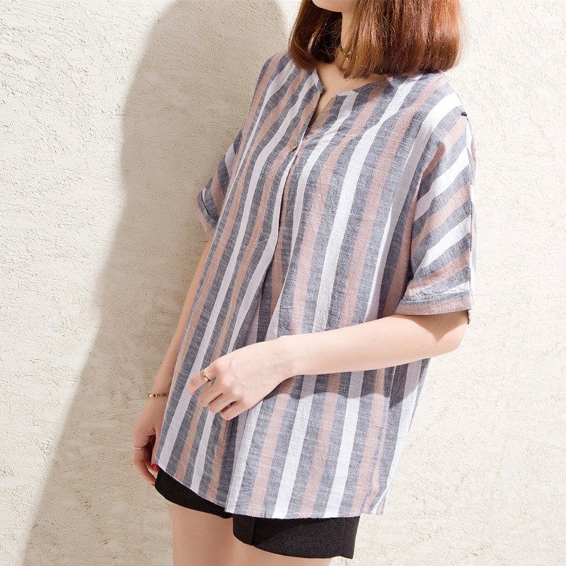 短袖女裝新款條紋短袖t恤女復古寬松韓版小心機上衣體恤衫