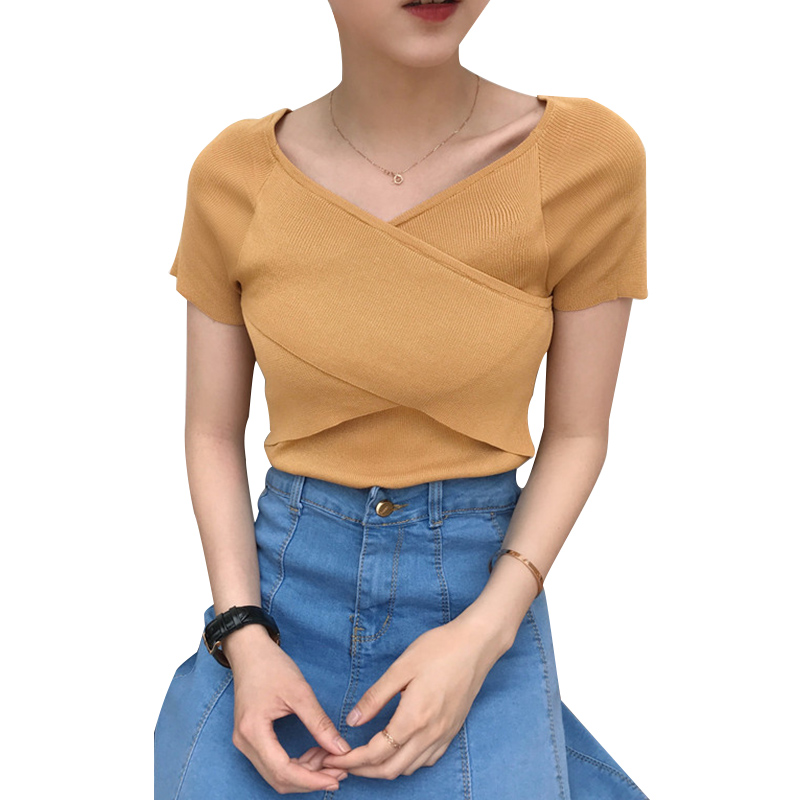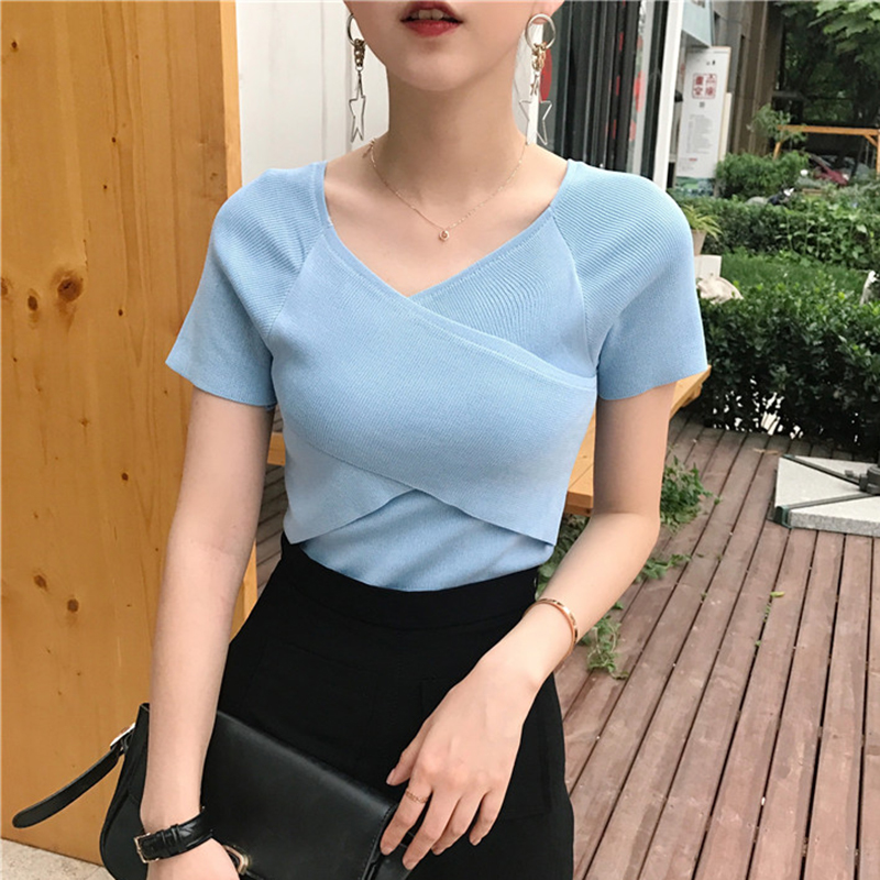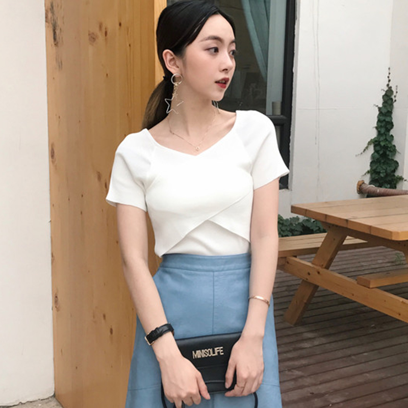 / 夏季新款女裝性感氣質交叉V領修身顯瘦短款學生針織短袖T恤上衣女
