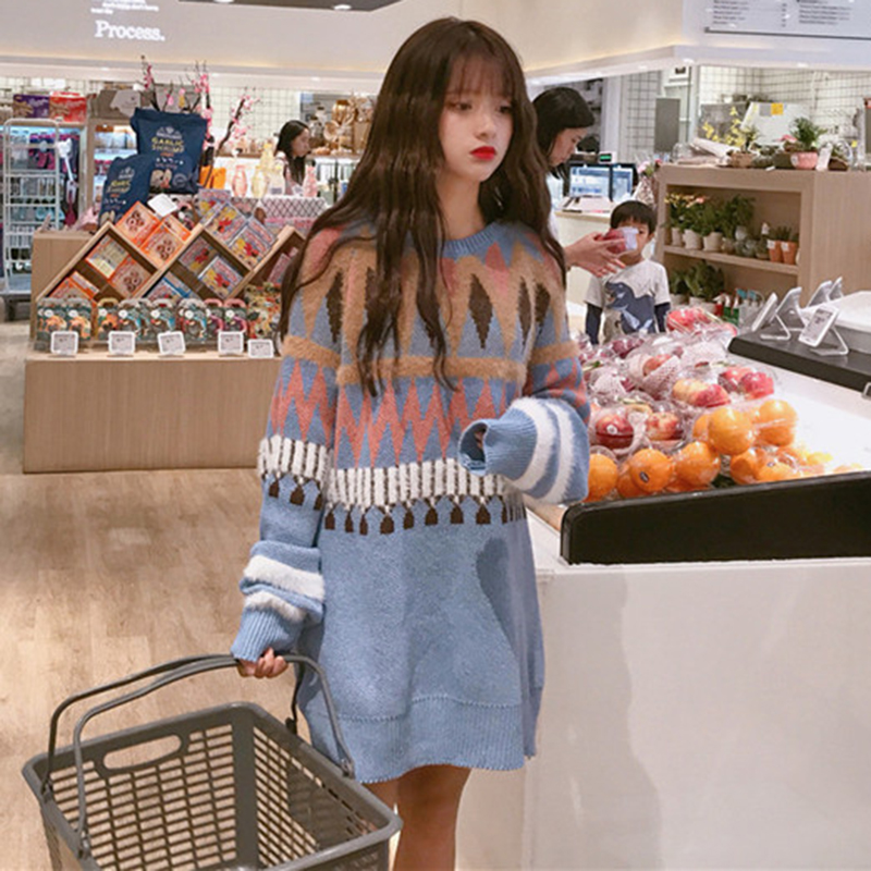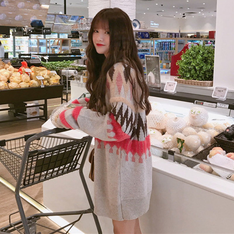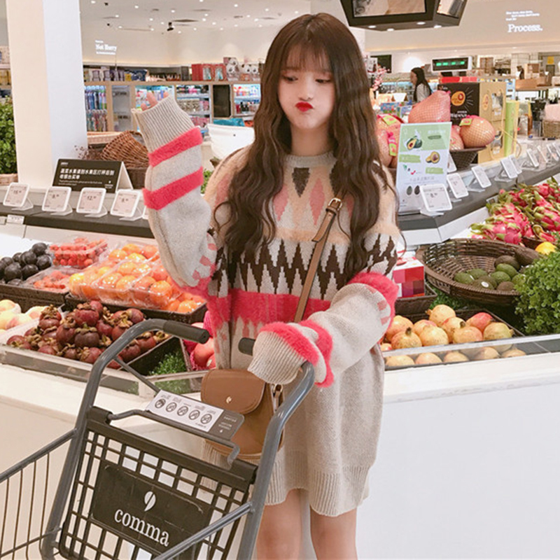 學院風長袖毛衣秋裝女2018新款韓版中長款拼色外套慵懶寬松上衣潮
