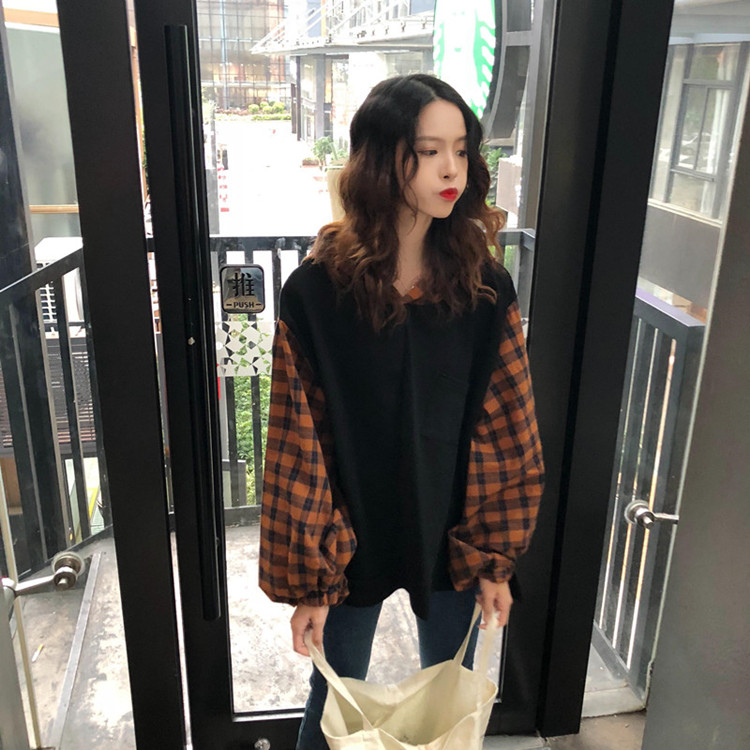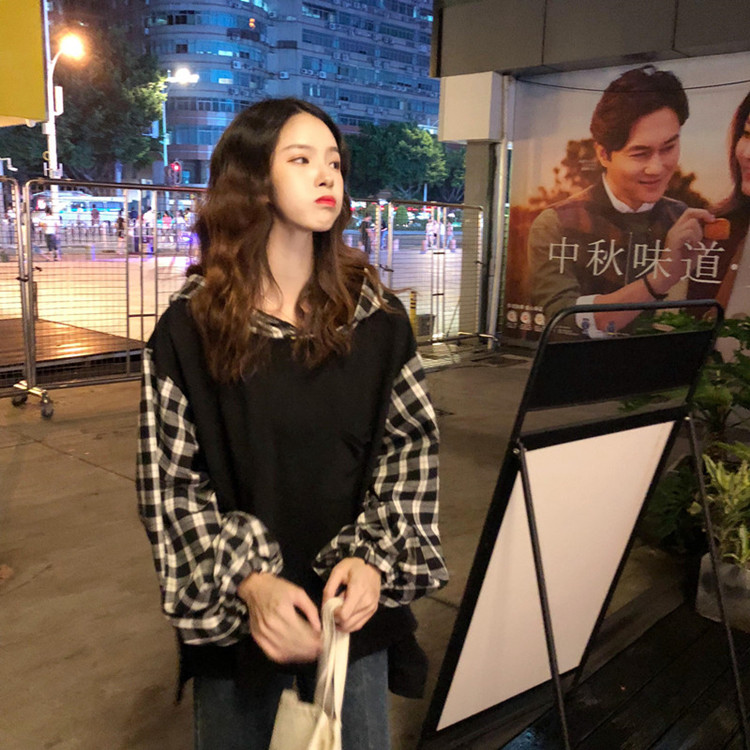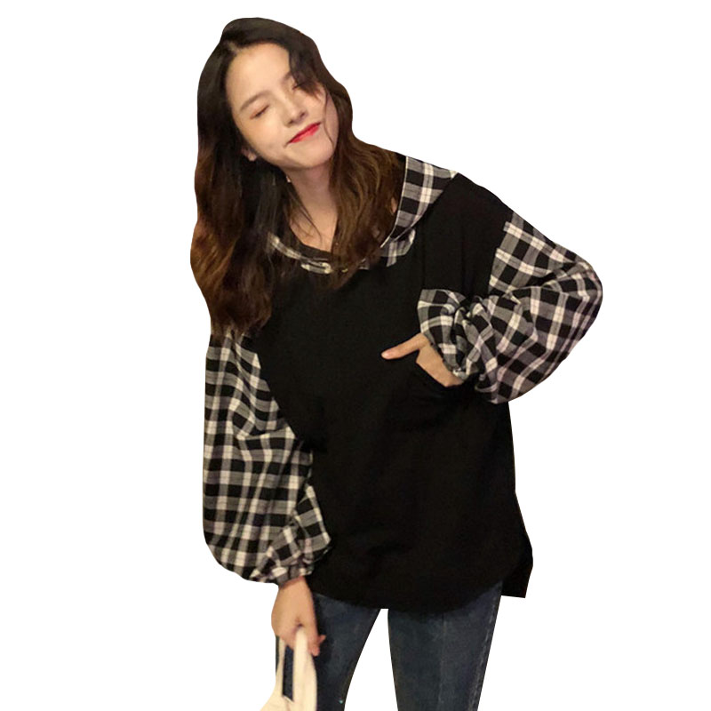 / 秋季女裝韓版中長款原宿風寬松格子拼接長袖連帽套頭衛衣上衣外套