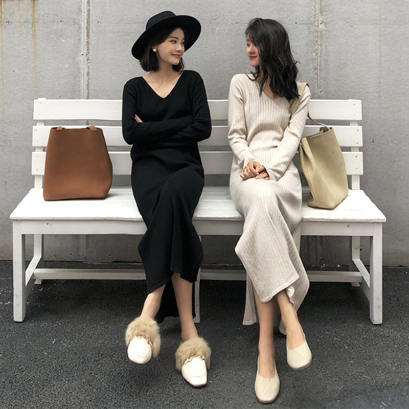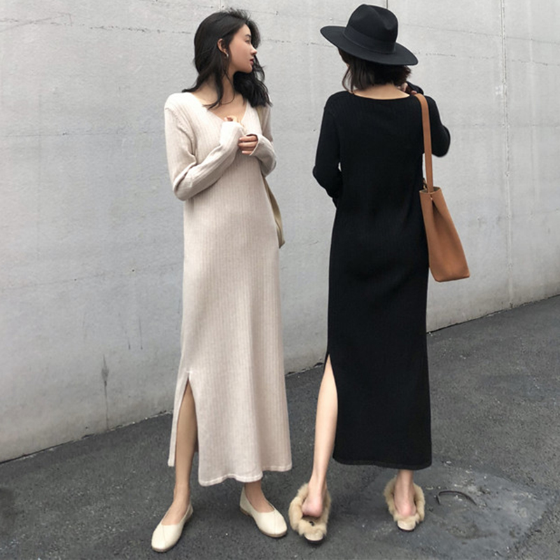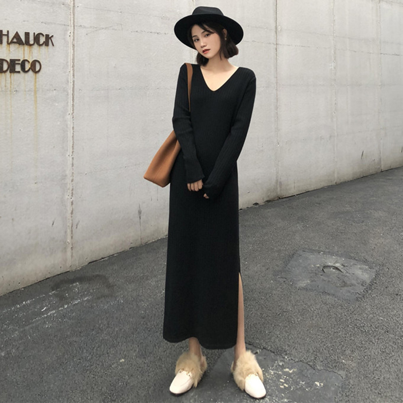 / 氣質v領黑色長袖針織連衣裙子女秋冬裝新款開叉法式復古egg桔梗裙
