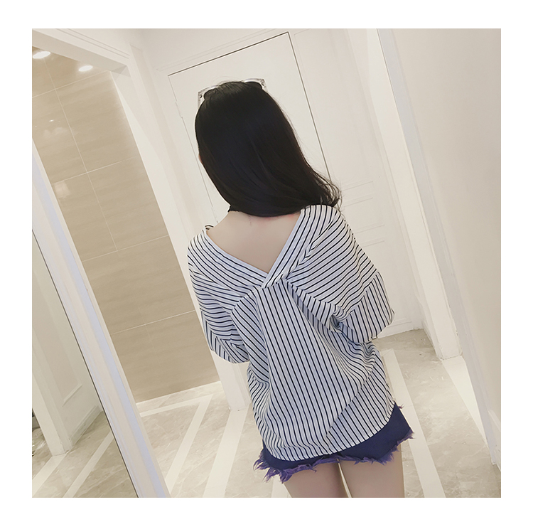 / 春秋裝新款女裝韓版修身條紋學生打底襯衣女前后V領露背中袖襯衫