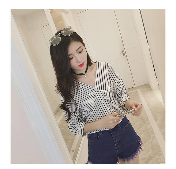 春秋裝新款女裝韓版修身條紋學生打底襯衣女前后V領露背中袖襯衫