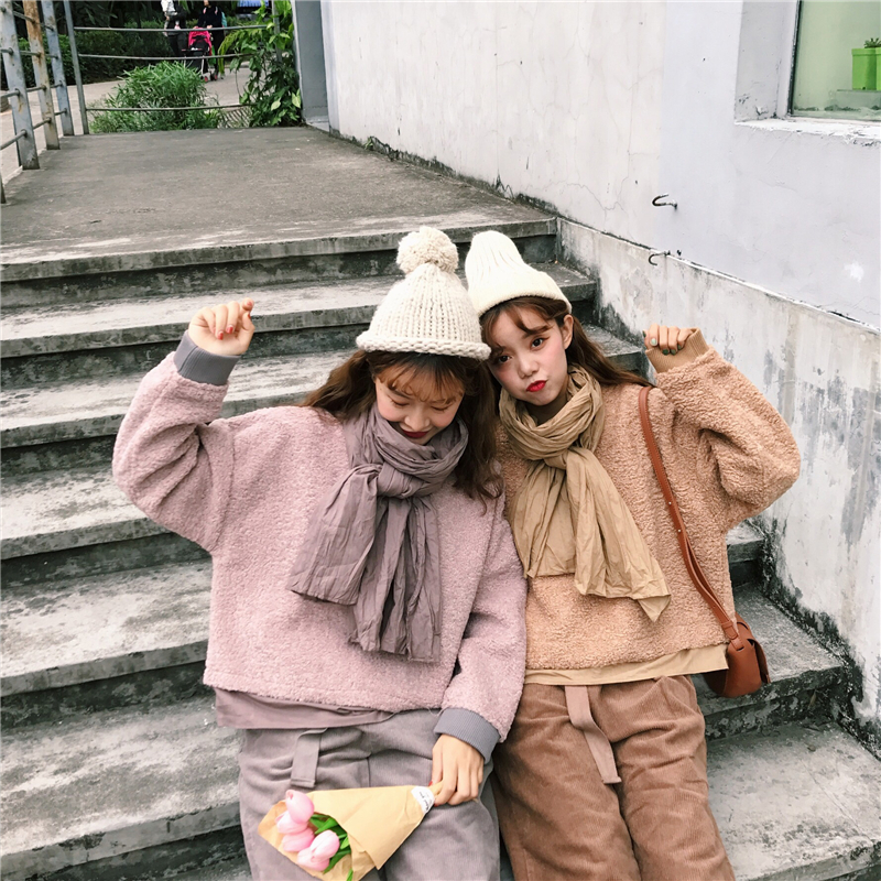 / 韓版時尚休閑套裝秋冬女裝仿羊羔毛衛衣外套+燈芯絨闊腿褲兩件套