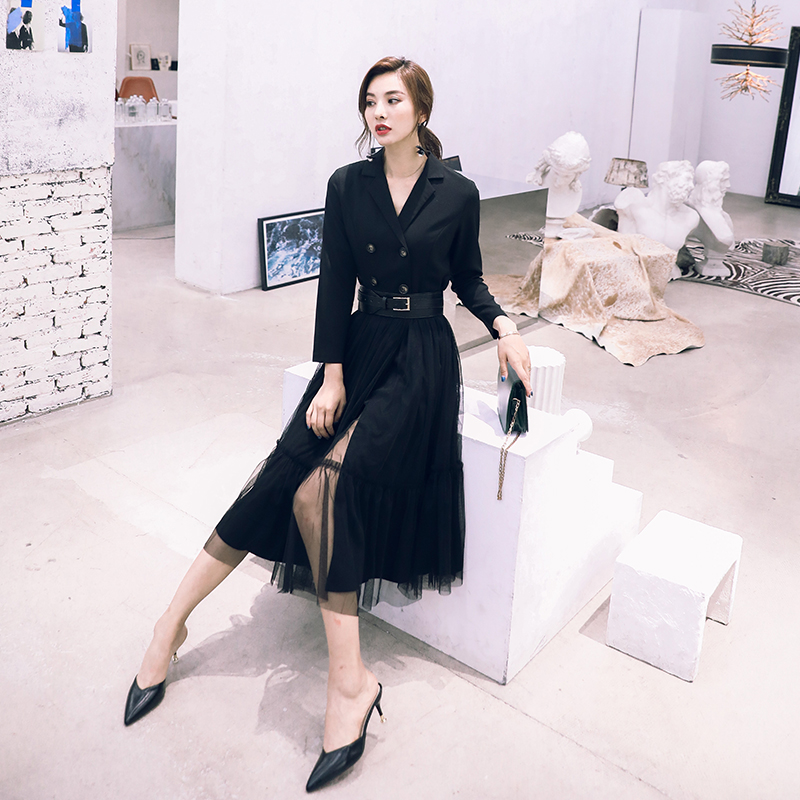 / 中長款V領連衣裙2018秋裝女新款韓版系帶排扣風衣網紗半身裙套裝