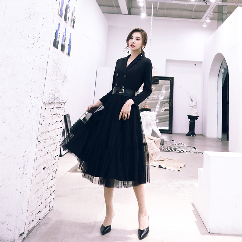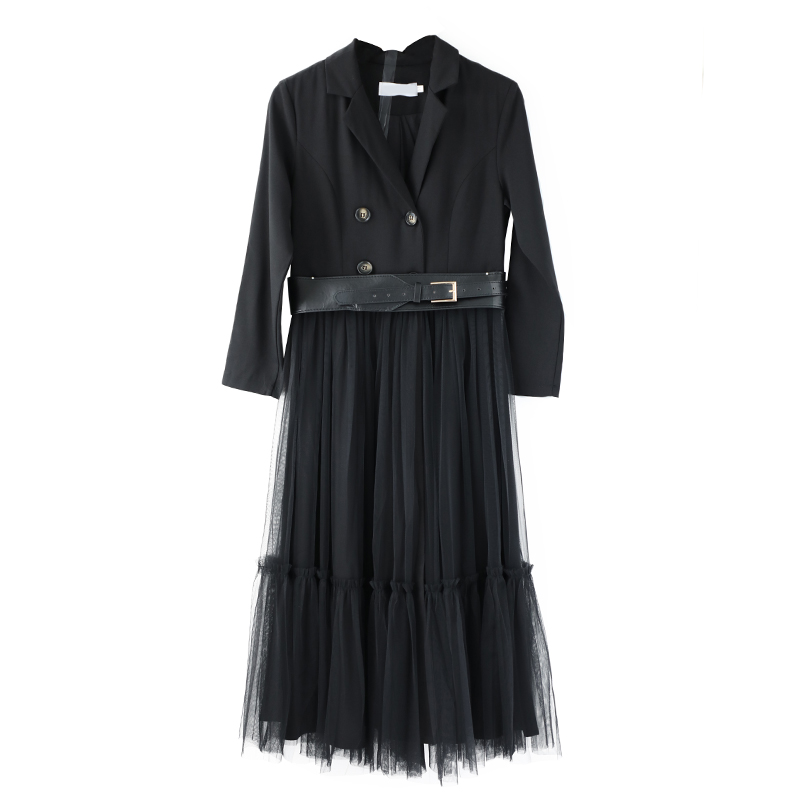 中長款V領連衣裙2018秋裝女新款韓版系帶排扣風衣網紗半身裙套裝