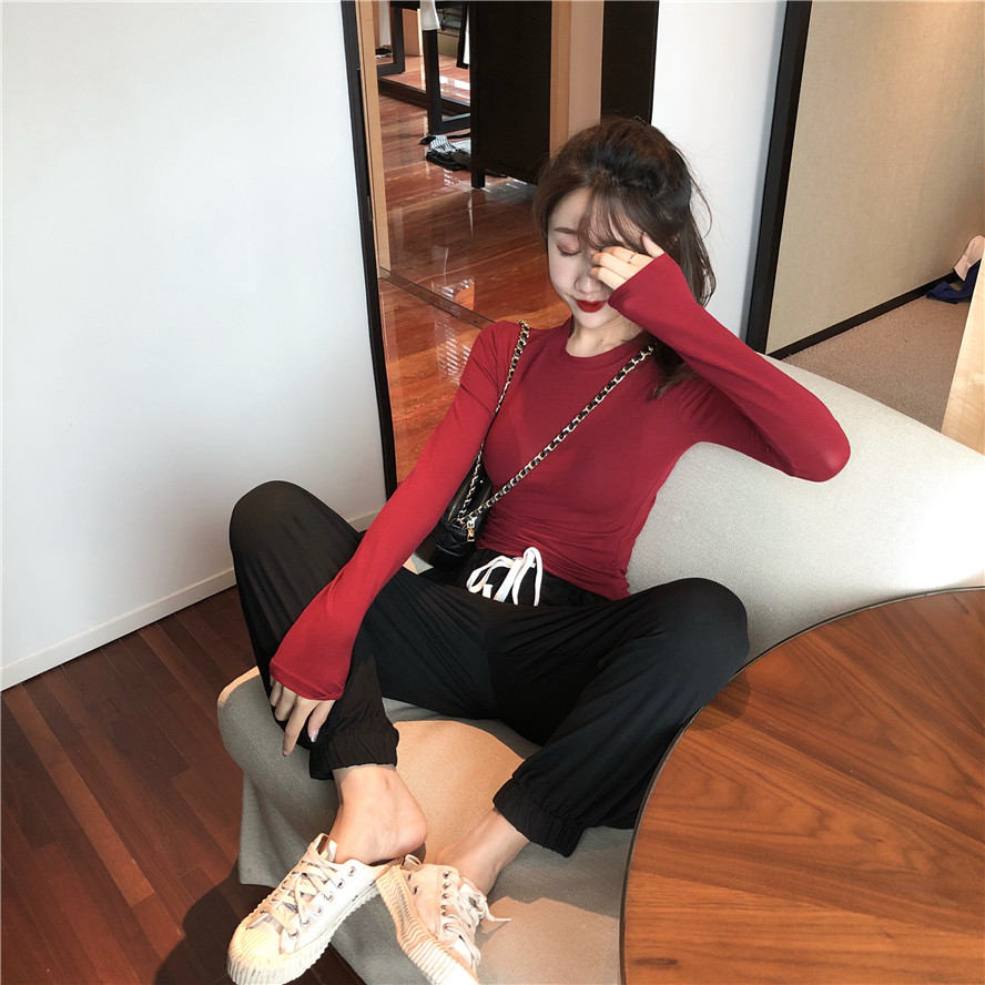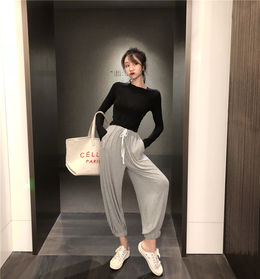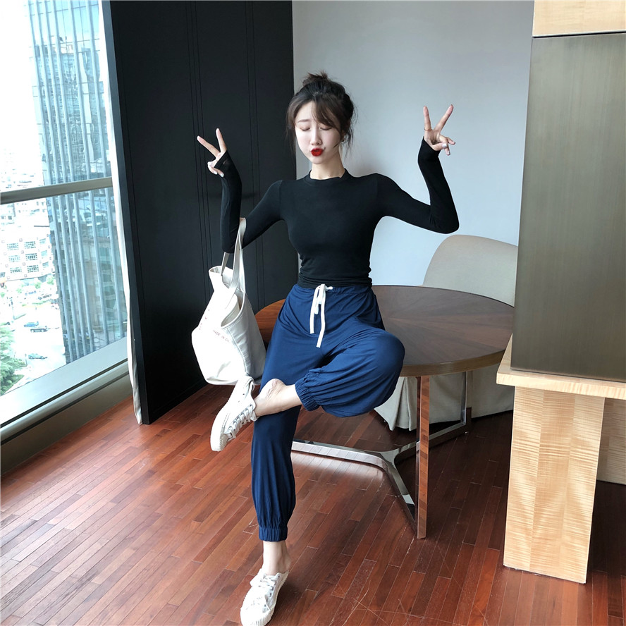 2018秋裝新款韓版微透修身打底衫束腳燈籠九分褲港風時尚氣質套裝
