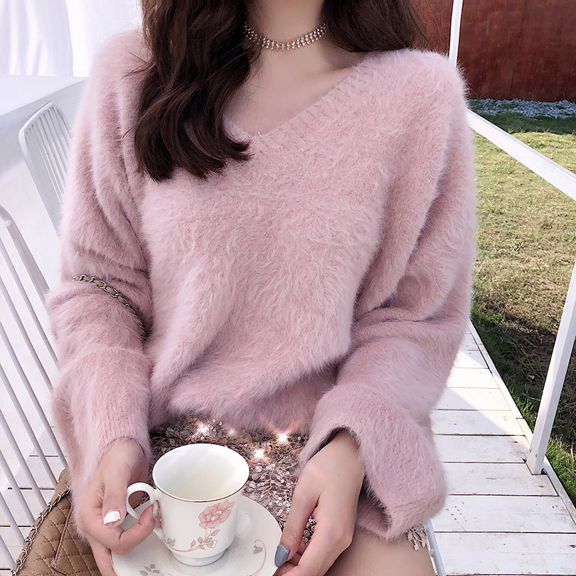/ 簡約慵懶風套頭毛衣女2018新款秋冬韓版加厚針織V領長袖貂絨上衣