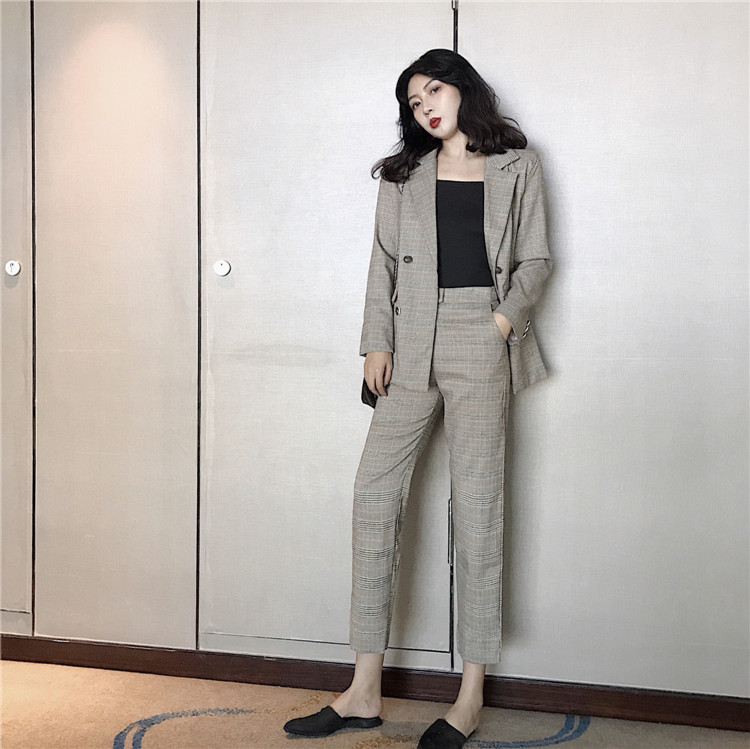 / 2018秋冬新款時尚套裝西裝格子外套高腰百褶裙九分褲西裝三件套女