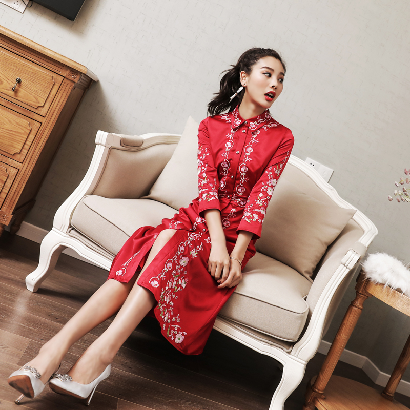 / 文藝范2018春裝新款通勤時尚連衣裙收腰顯瘦polo領長袖鉛筆裙子潮
