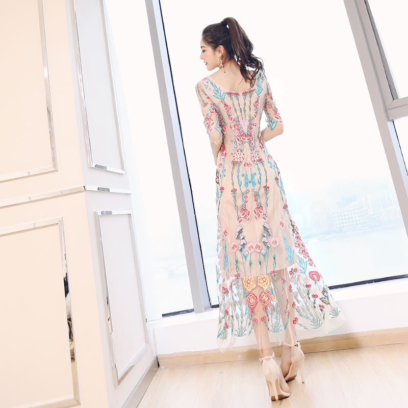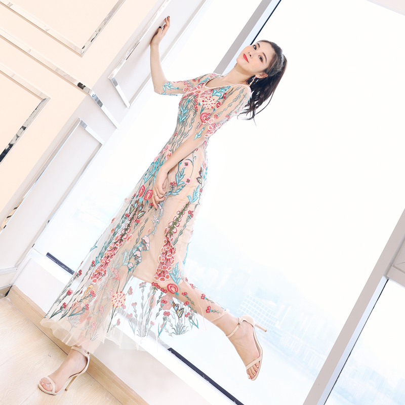 s秀2018新款女裝名媛氣質V領網紗刺繡超仙連衣裙長裙修身顯瘦潮