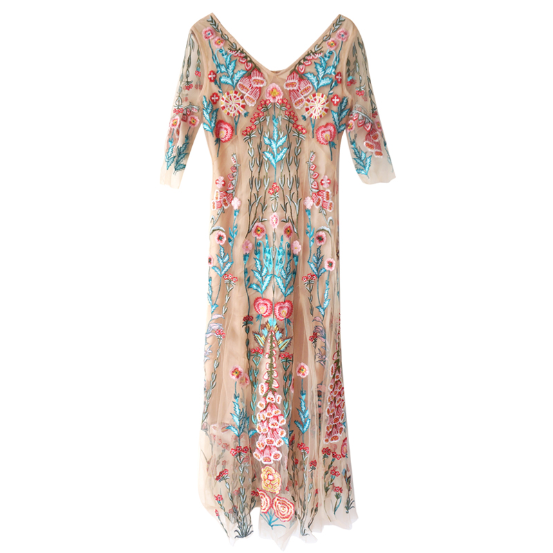 / s秀2018新款女裝名媛氣質V領網紗刺繡超仙連衣裙長裙修身顯瘦潮