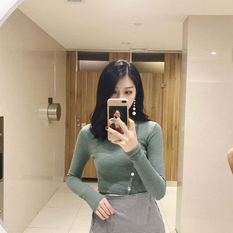 港味復古chic風斜扣螺紋針織新款韓版修身顯瘦純色長袖襯衫上衣女