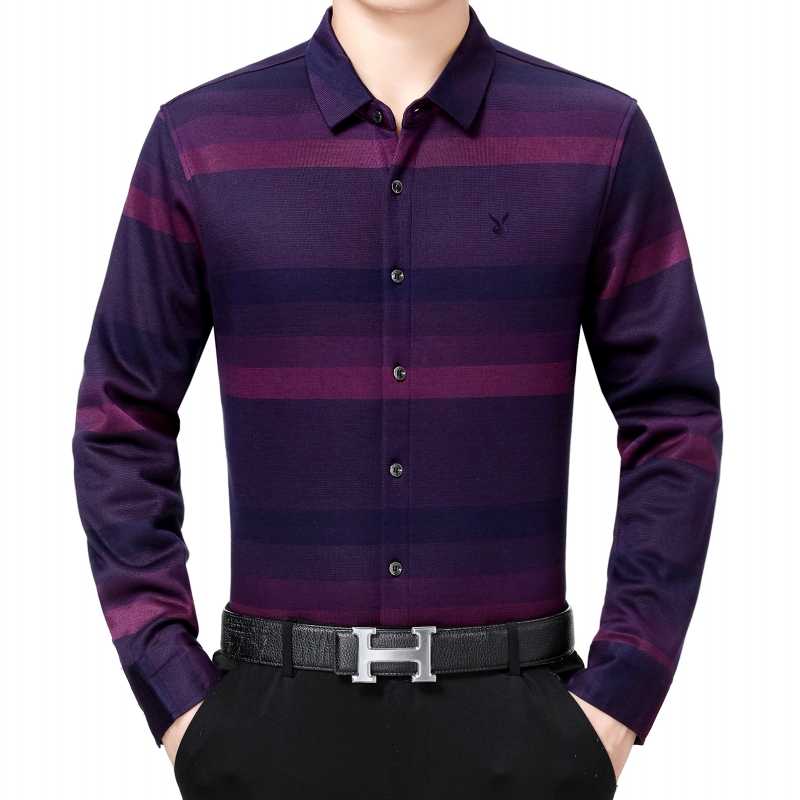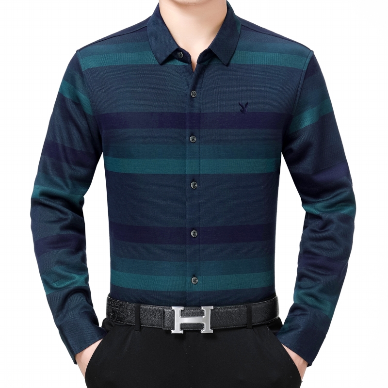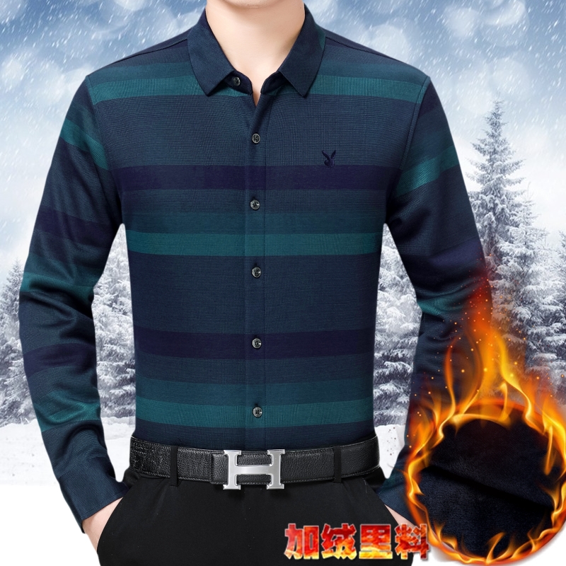 花花公子正品中年男人長袖保暖襯衫商務男裝加絨加厚條紋襯衣冬季