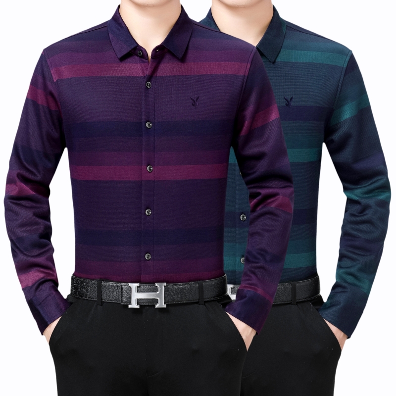 / 花花公子正品中年男人長袖保暖襯衫商務男裝加絨加厚條紋襯衣冬季