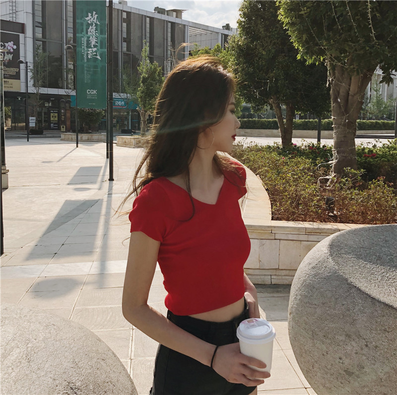 / 夏裝2018新款鏤空短袖針織衫顯瘦露臍上衣修身純色大V領打底衫女