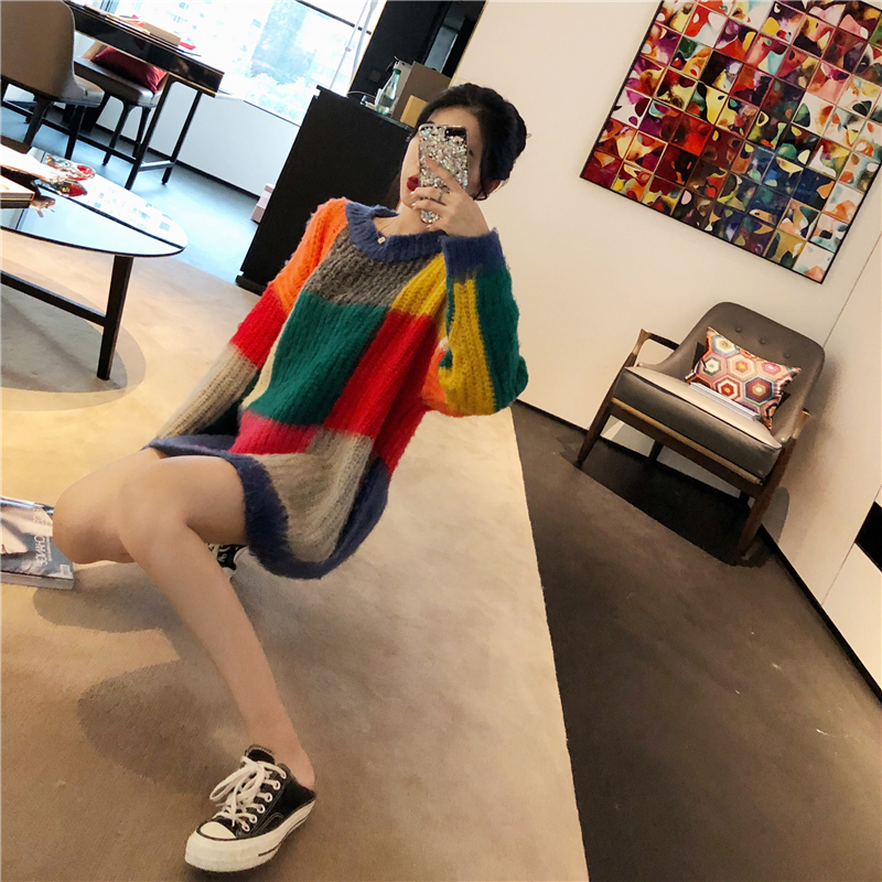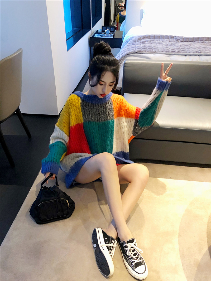 chic慵懶風毛衣女套頭寬松加厚秋季拼接格子甜美小清新學生針織衫