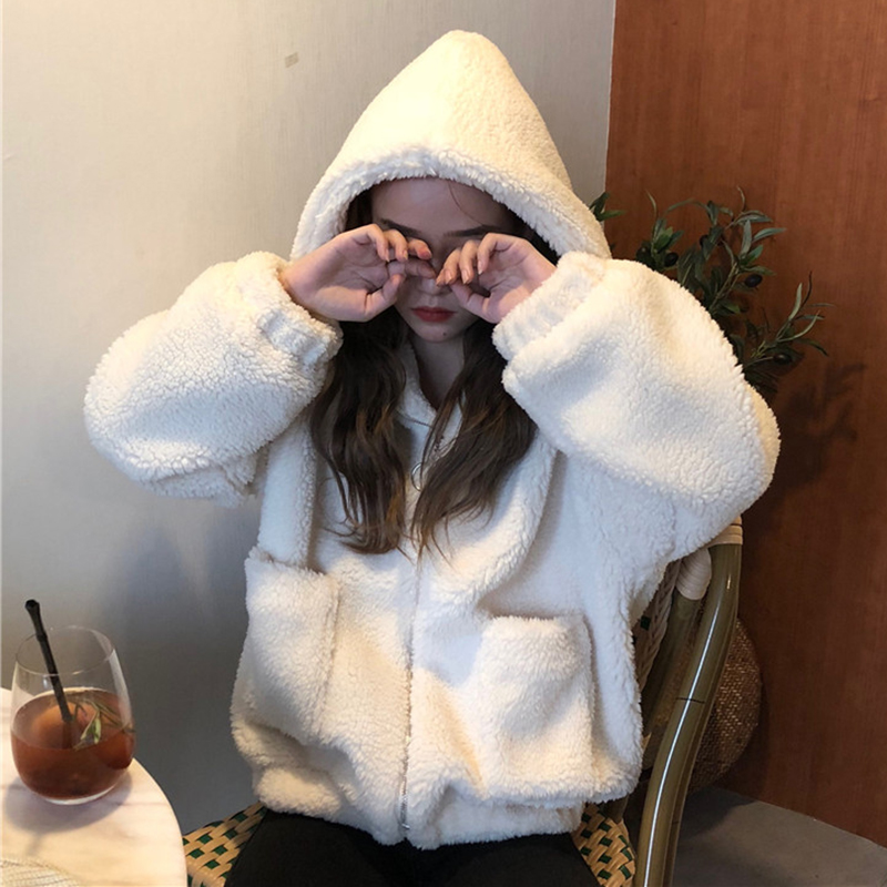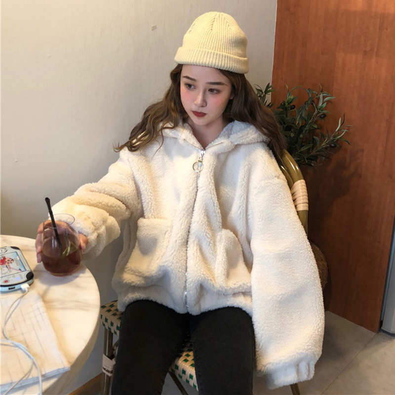 秋冬女裝新款慵懶風保暖毛絨上衣chic學生寬松連帽長袖開衫外套女