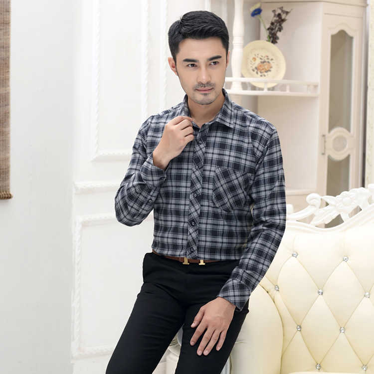 春秋全棉男士長袖襯衫寬松純棉休閑襯衣中老年磨毛格子襯衫法蘭絨