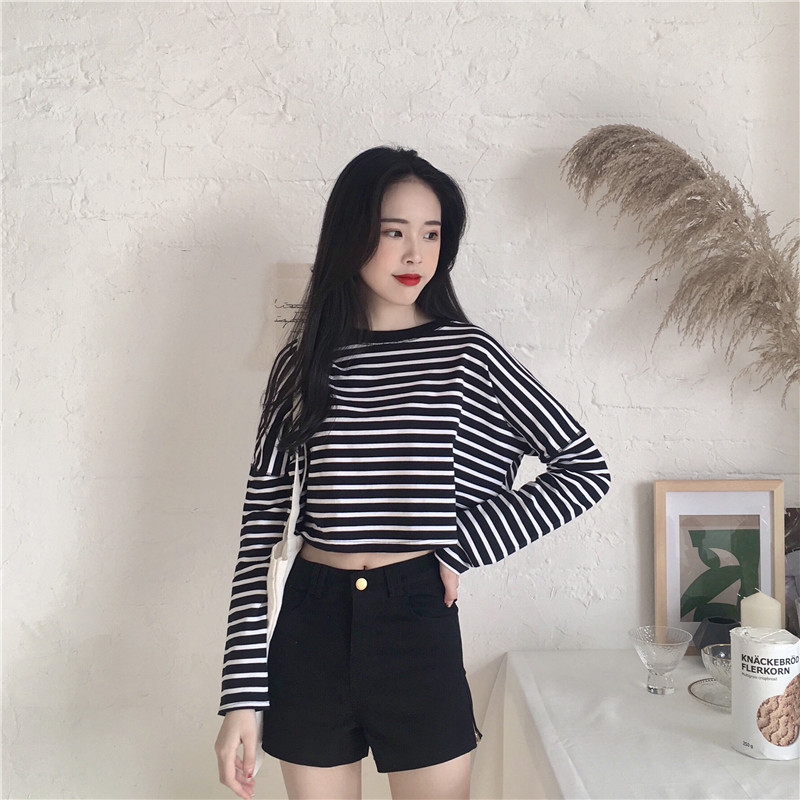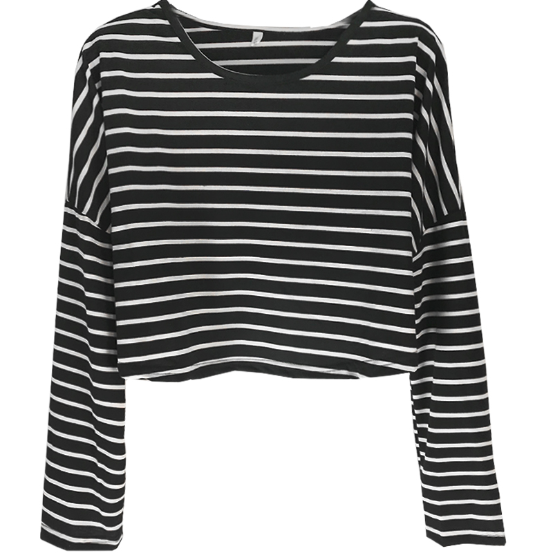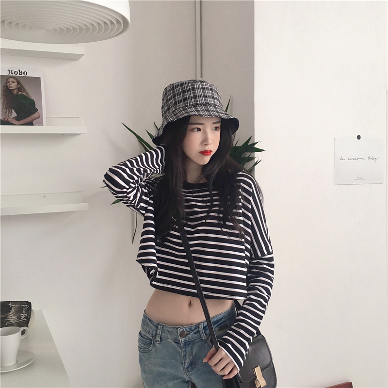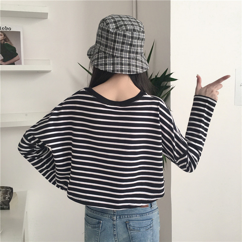 / 秋裝新款女裝百搭拼色條紋短款寬松顯瘦學生長袖打底衫T恤上衣女