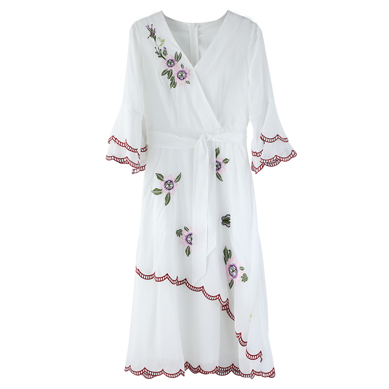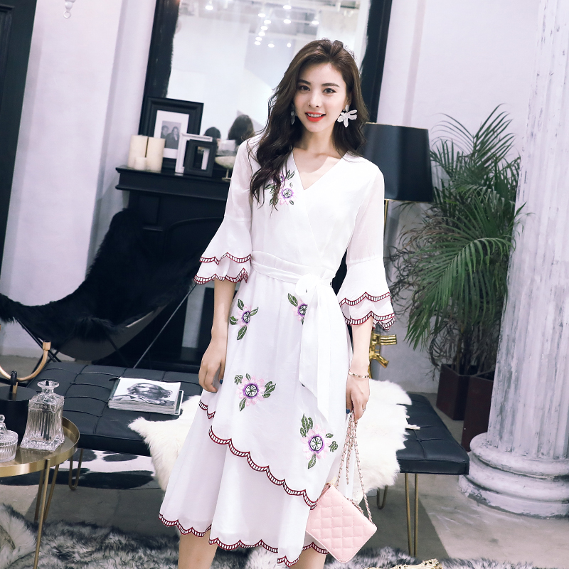 名媛氣質連衣裙2018夏季復古v領長裙小白裙修身刺繡繡花禮服裙子