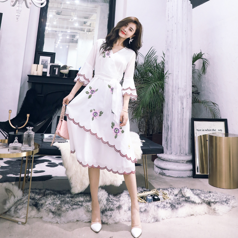 / 名媛氣質連衣裙2018夏季復古v領長裙小白裙修身刺繡繡花禮服裙子