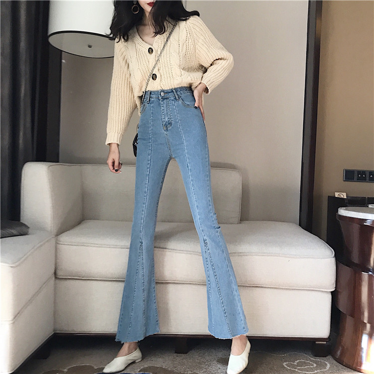 褲子女秋季新款韓版彈力高腰顯瘦修身拼接牛仔褲毛邊微喇叭牛仔褲