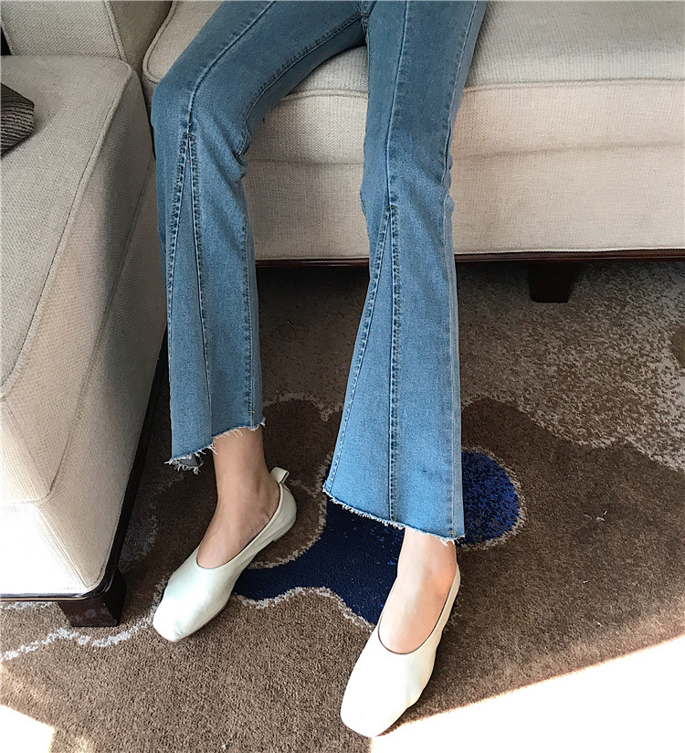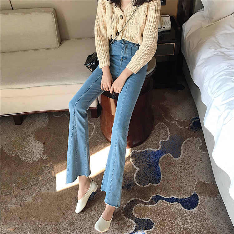 / 褲子女秋季新款韓版彈力高腰顯瘦修身拼接牛仔褲毛邊微喇叭牛仔褲