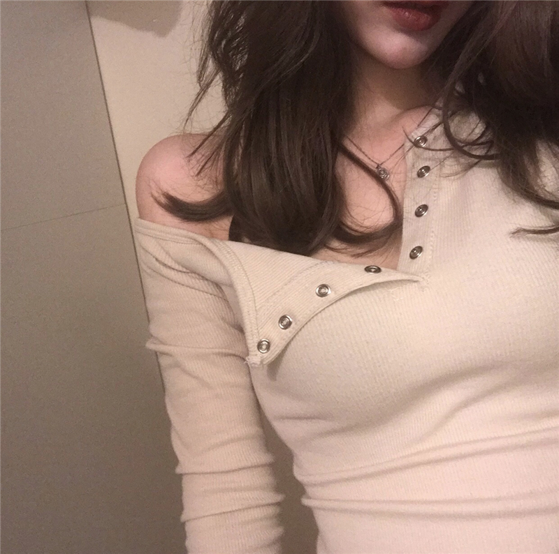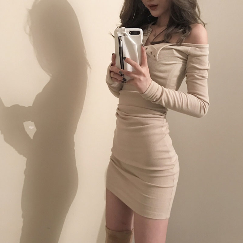 韓版女裝秋2018新款女氣質百搭V領暗扣螺紋修身打底包臀連衣裙潮