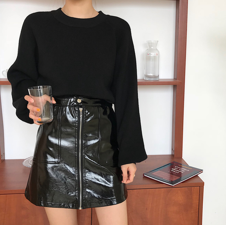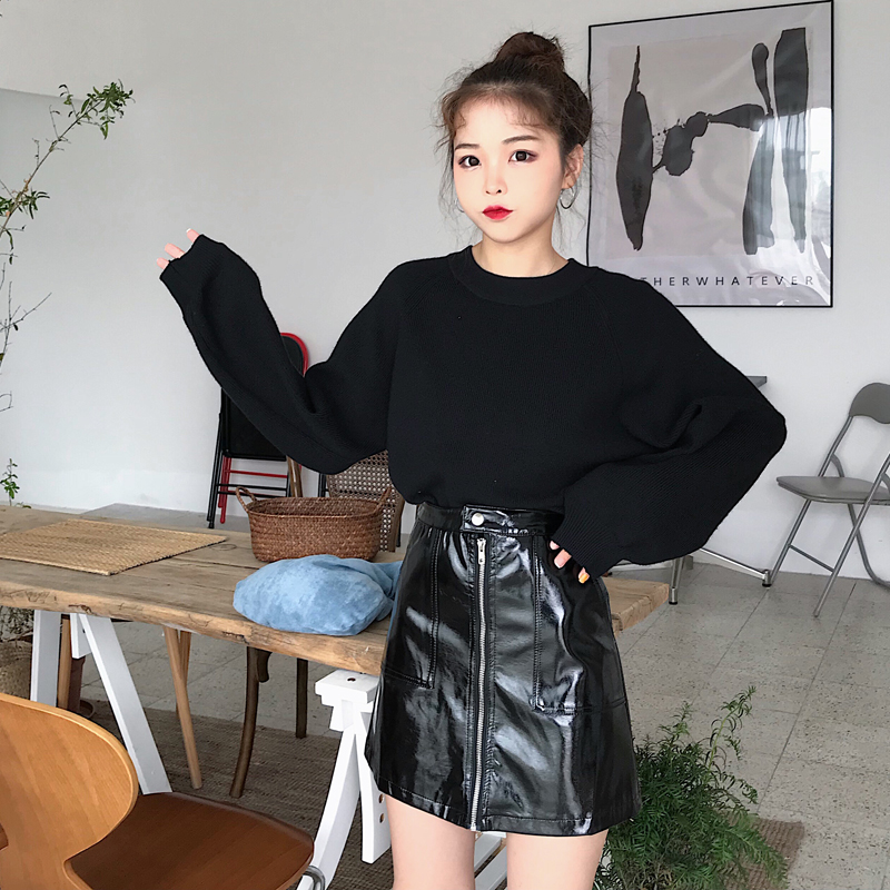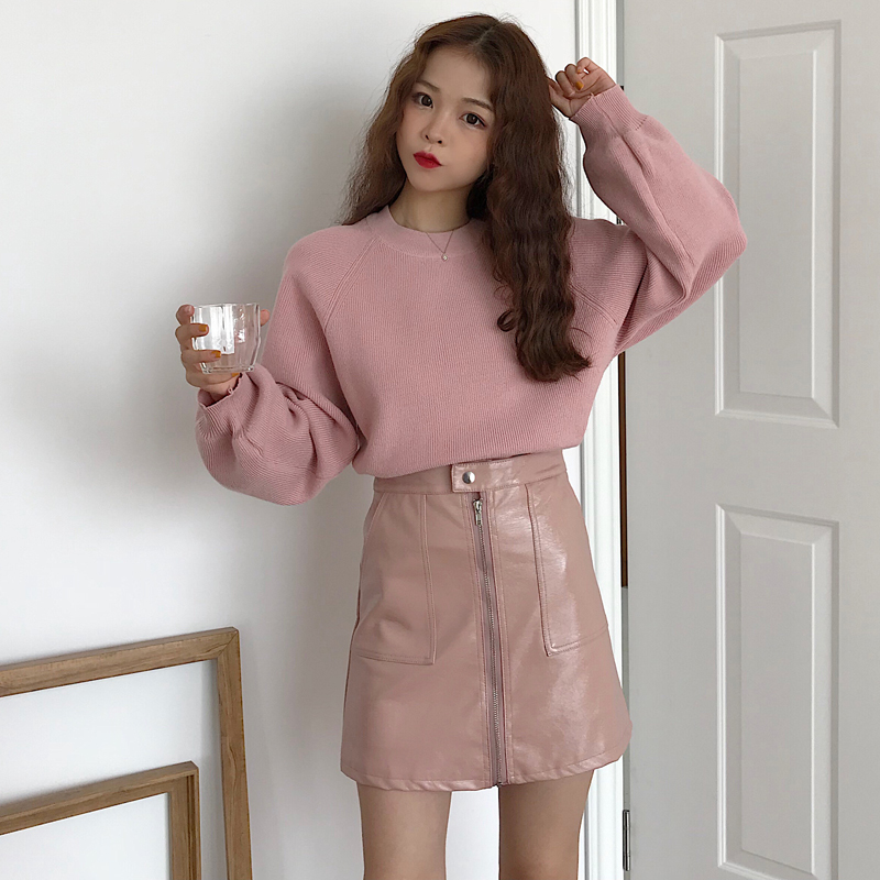 / 韓版時尚休閑套裝秋季女裝毛衣針織衫+氣質A字半身裙皮短裙兩件套