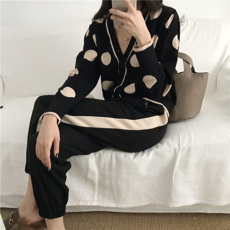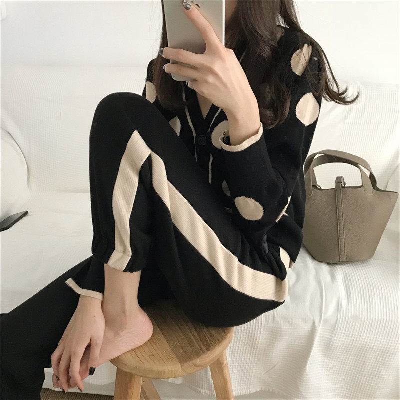 / 韓系時尚女神套裝秋兩件套大波點羊毛v領針織衫+寬松側條紋毛呢褲