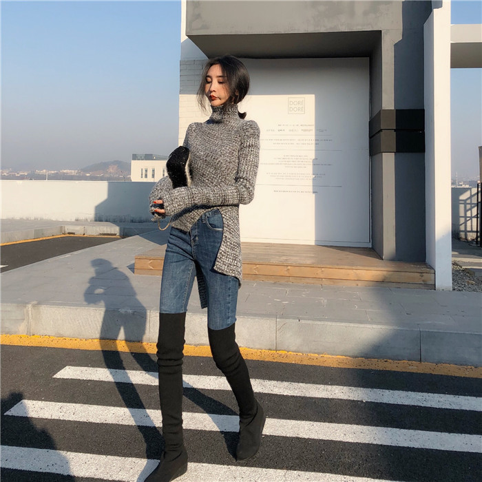 毛衣外套女韓版2018新款高領修身顯瘦下擺開叉不規則毛衣針織衫潮