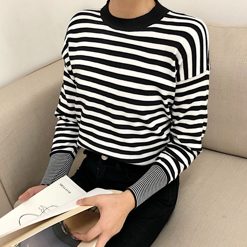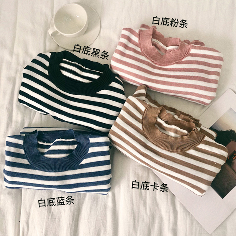 / 氣質條紋修身顯瘦打底針織衫女秋冬裝新款外穿套頭上衣圓領T恤潮