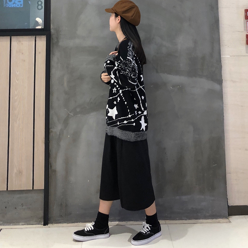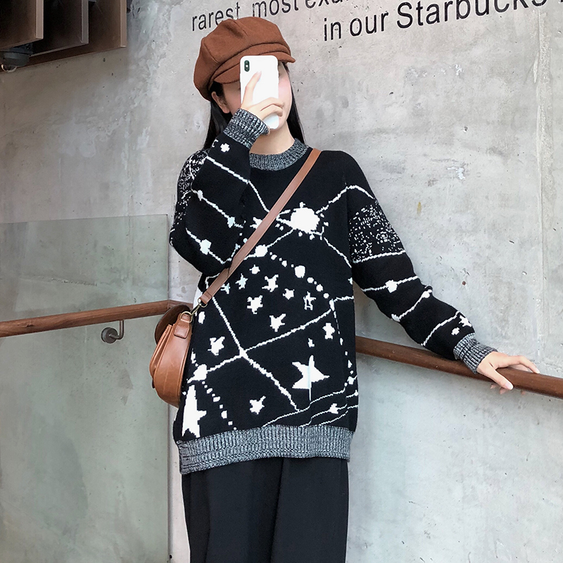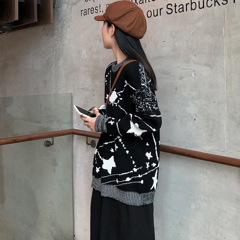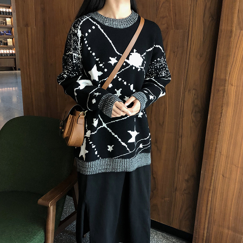 御姐套裝女秋冬新款星空寬松毛衣針織外套高腰顯瘦開叉黑色半身裙