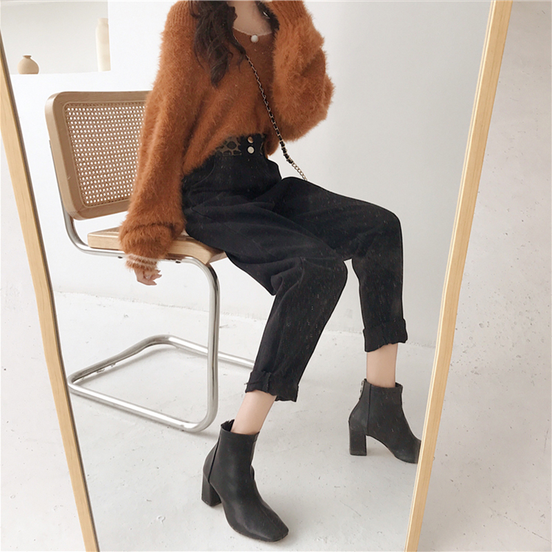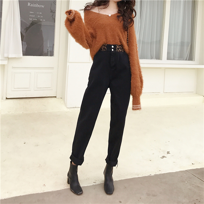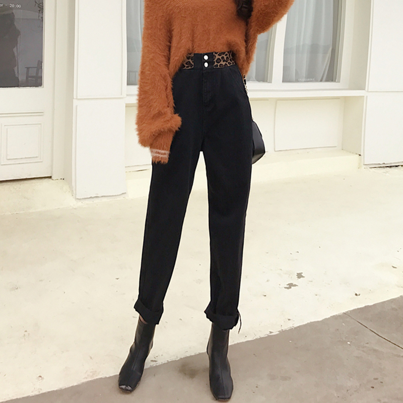 老爹褲女秋冬裝2018新款韓版撞色松緊高腰牛仔褲學生寬松哈倫褲子