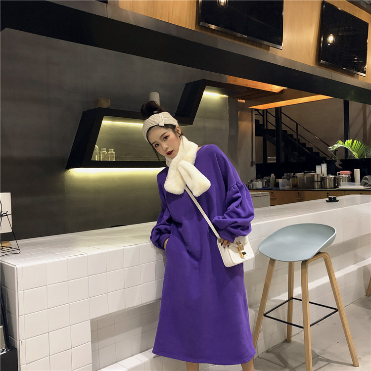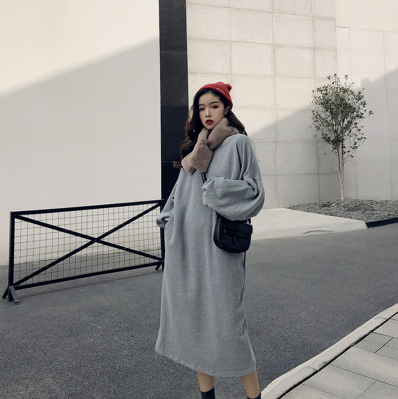 復古韓國chic泡泡袖慵懶風長款寬松顯瘦百搭加絨衛衣裙女2018新款