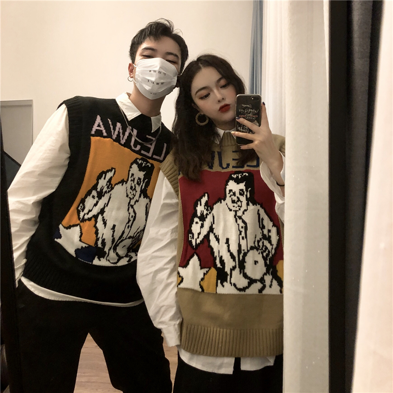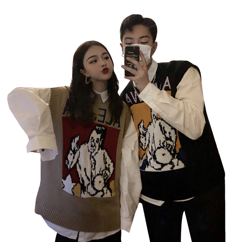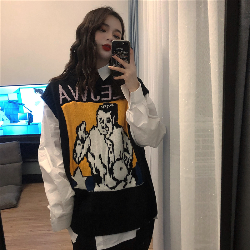 / 秋冬韓版慵懶風寬松卡通無袖針織衫毛衣馬甲背心外套+打底襯衫女